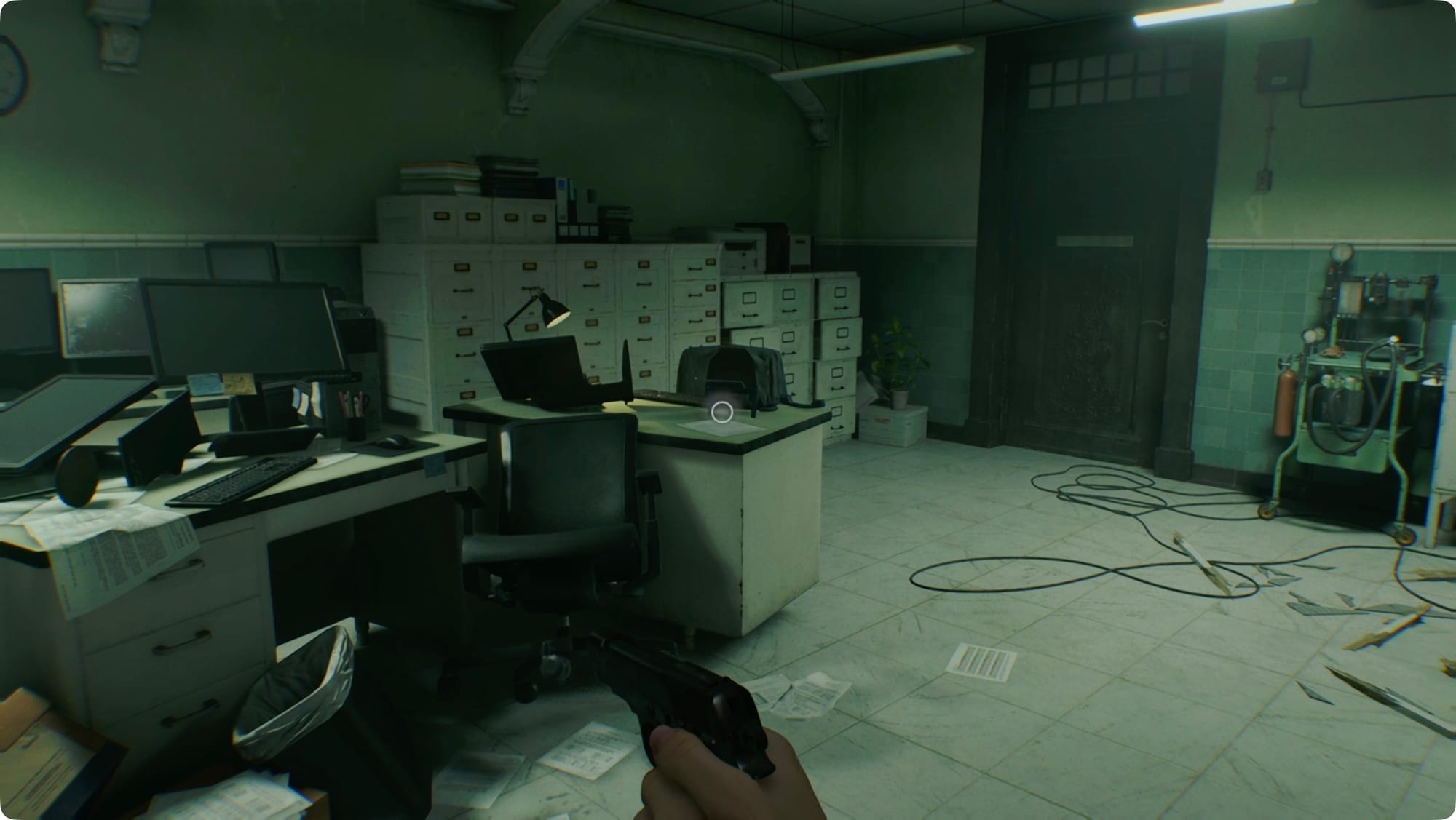 Interact with the painting behind the desk to reveal a switch. Two Blisterheads will crash through the window, and the two bodies in here with you will become zombies. Shotgun them all.