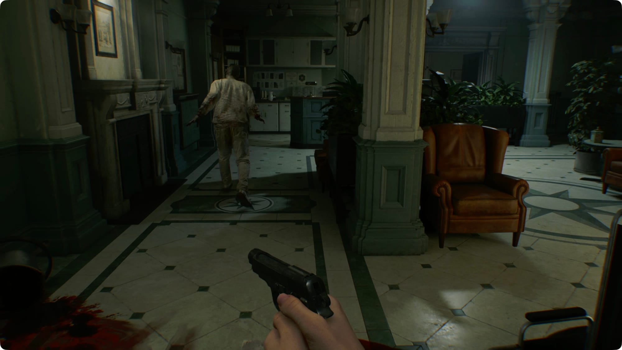 Go through the dogleg and grab some more Handgun Ammo. Break through the door to the Lounge.