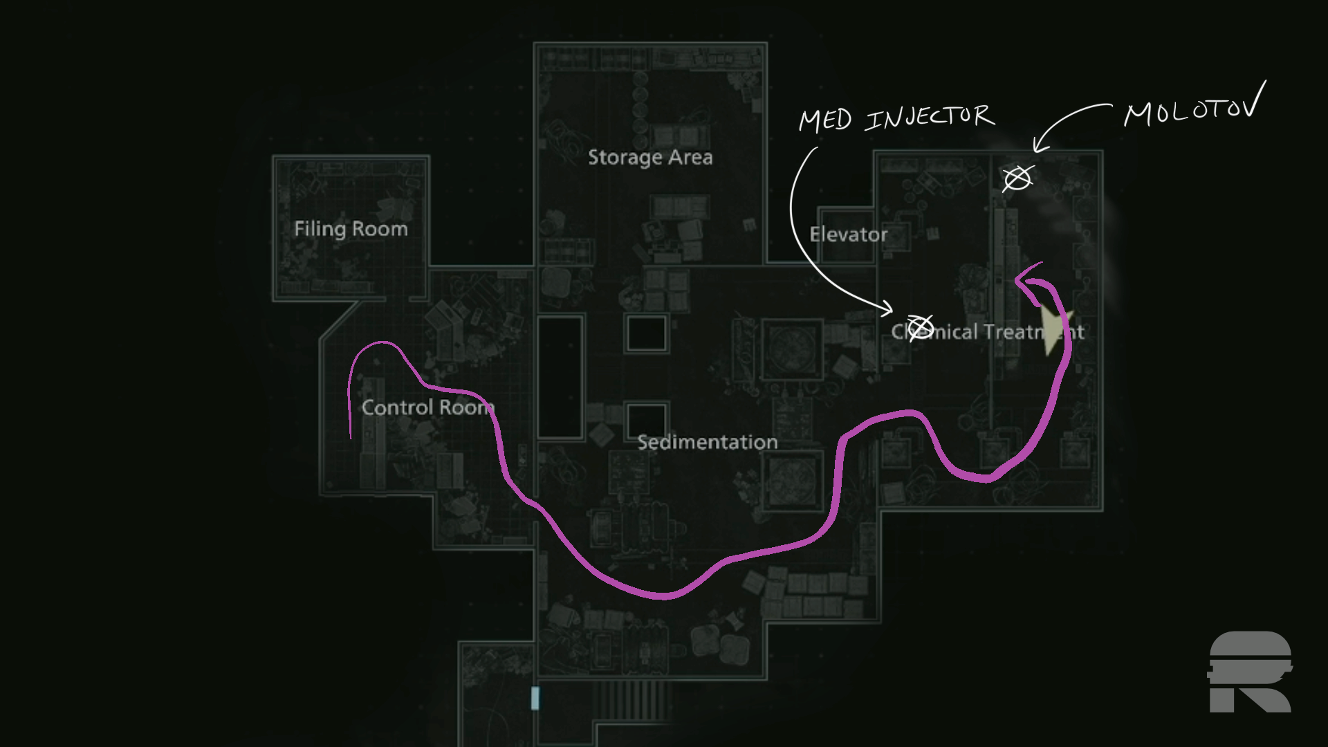 On your way back out, just before you exit Chemical Treatment, there’s a Med Injector on the barrels to the right.