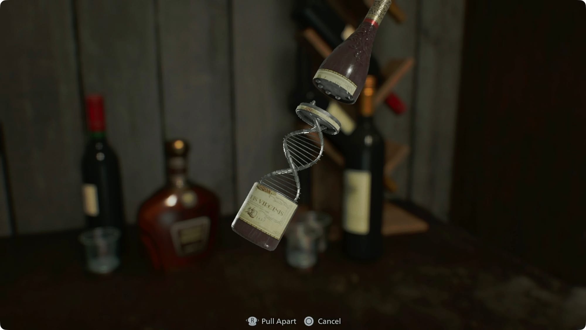 On the left side as you enter (right if you’re behind the desk), pick up the wine bottle. Examine it closer to see that it’s a puzzle. Rotate the top and open it for the Double Helix Model.