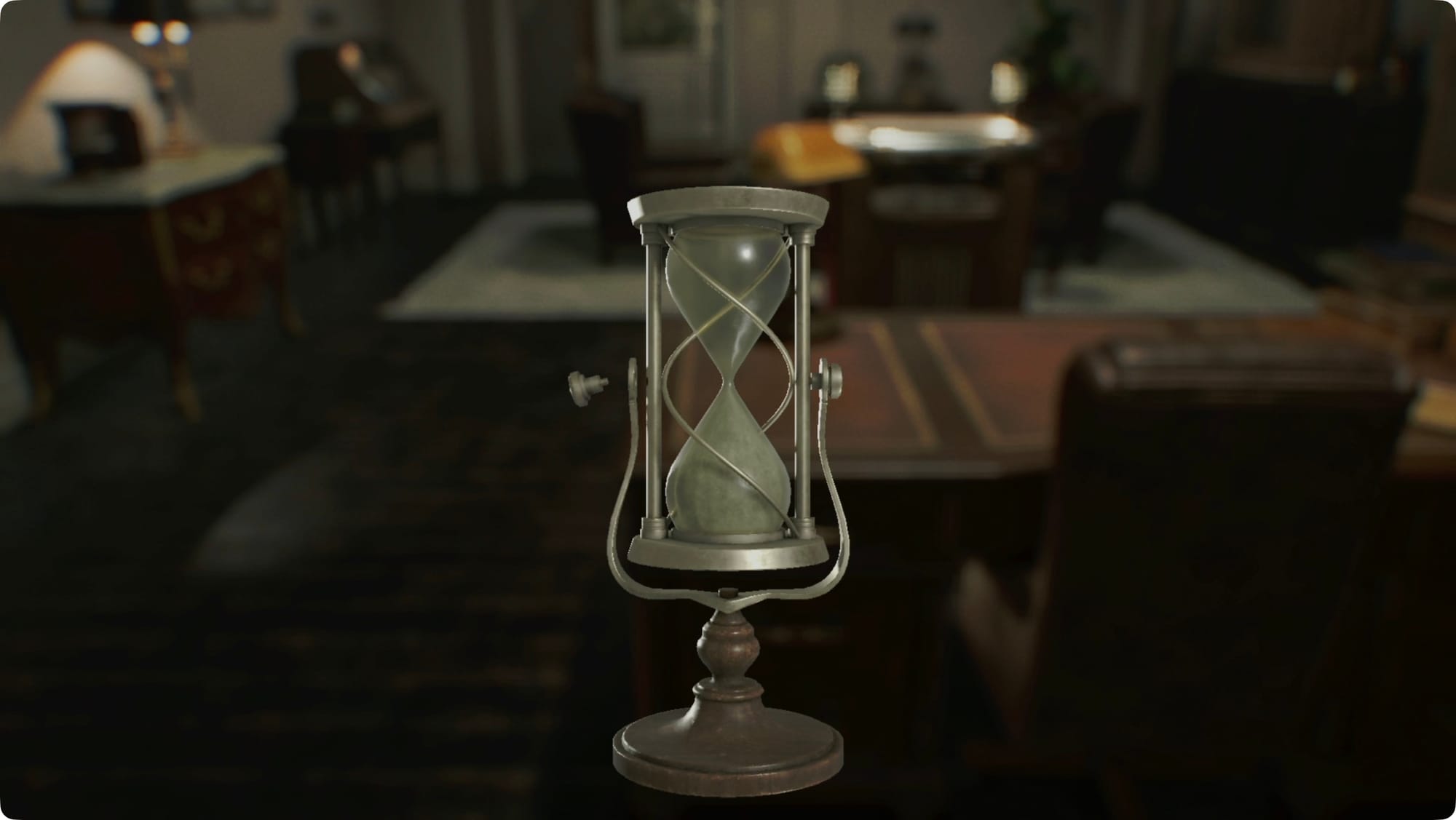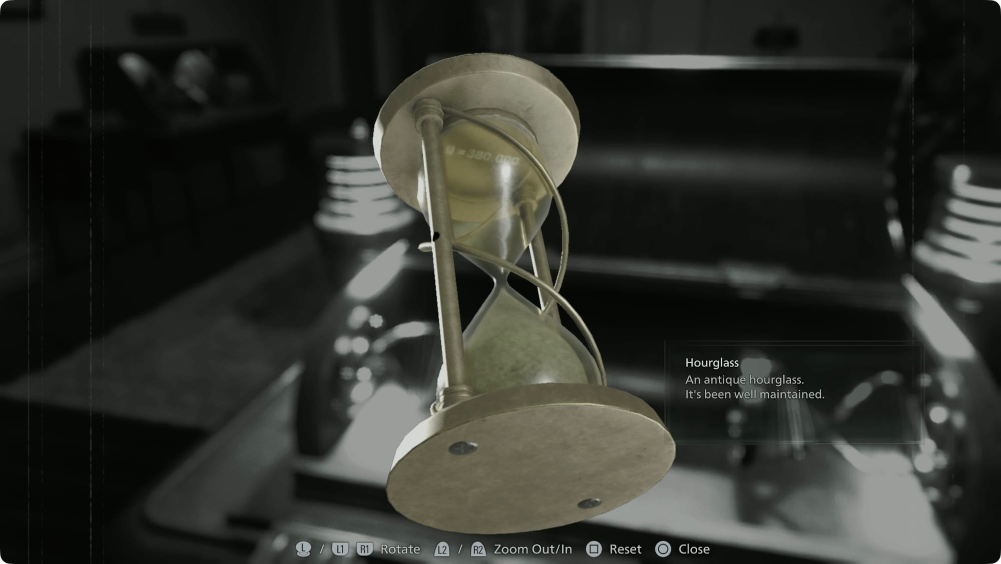 You’ll land in a very clean Reception. Over in the far right corner is a typewriter and an Item Box. While you’re here, open your inventory and examine the Hourglass. Flip it over to drain some of the sand, and you’ll spot a secret printed behind the glass — U = 380,000. You can drop it in the Item Box once you see it.