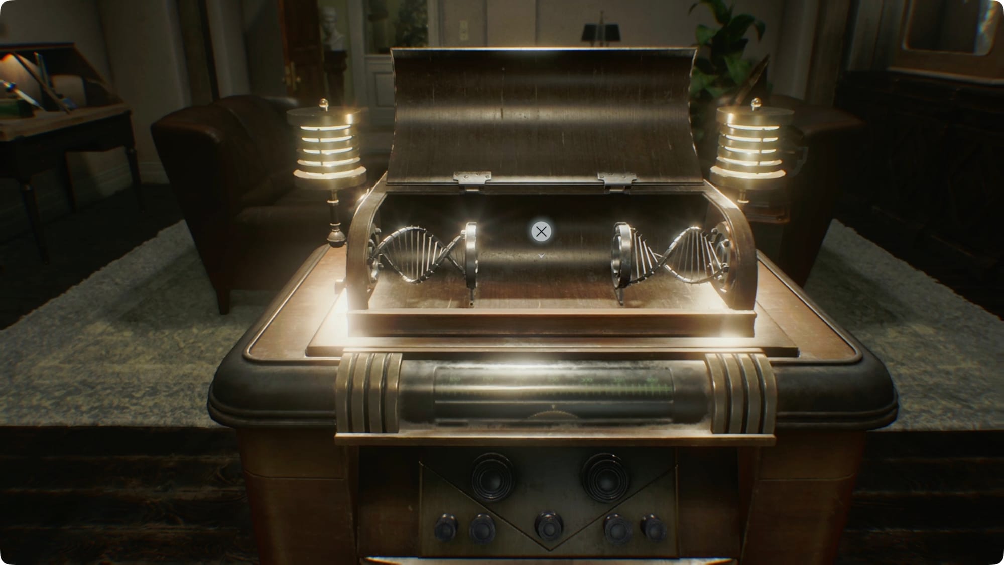 Interact with the old-timey radio in the middle of the room to open a hidden compartment. Slot in the Double Helix Model to turn the entire room into an elevator.