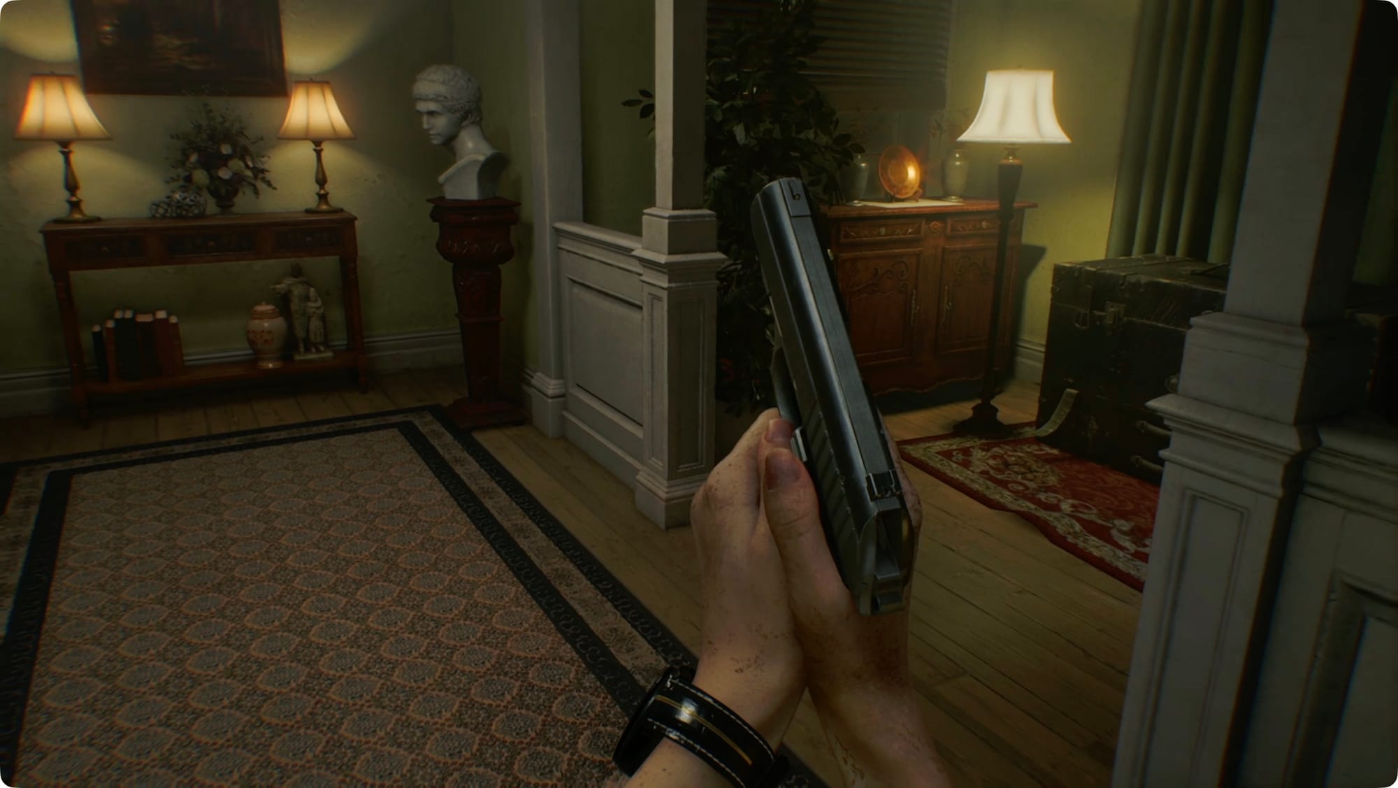 When you first enter the house, read the Visitor Record file ahead of you. Follow the hallway deeper into the house. There’s an Item Box on the right. Continue around to the VIP Suite.