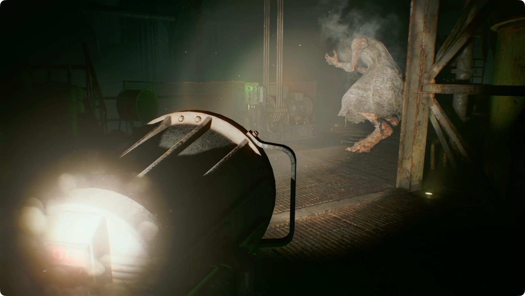 Take a right and snake back to the switch. This one’s stuck. Before you try to force it, look to your left and stun The Girl again. There’s a Molotov on the cart to your right. You should have enough time to unstick the lever. The lights will make her run.