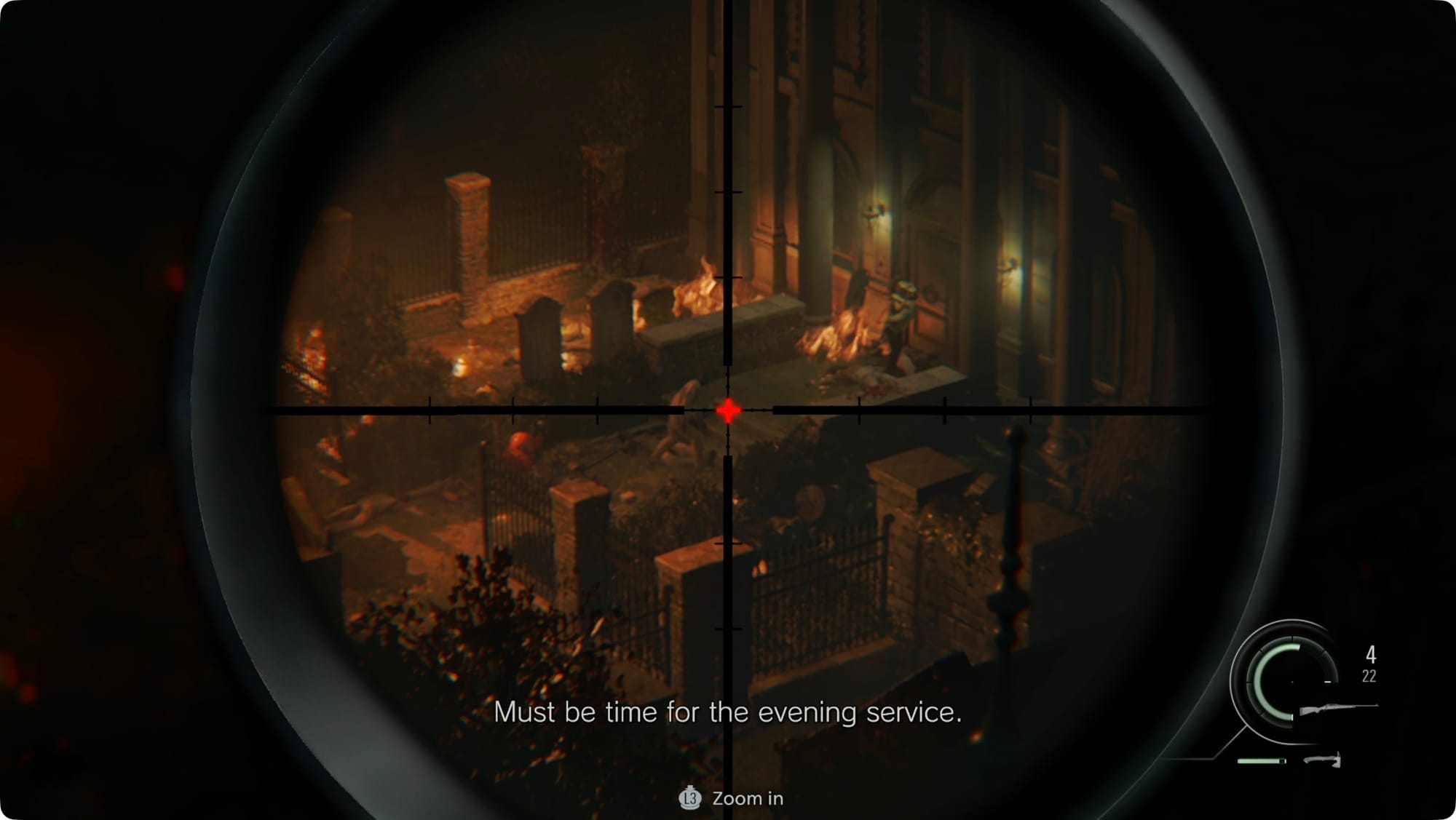 You’ll have to protect her while she tries to get into the church. Just keep watching for zombies and timing your reloads for the gaps. After a couple waves, another butcher zombie will show up. He’ll take several shots to put down, so prioritize him — Grace won’t survive if he gets close. Now is the time for that exploding barrel if you need it.