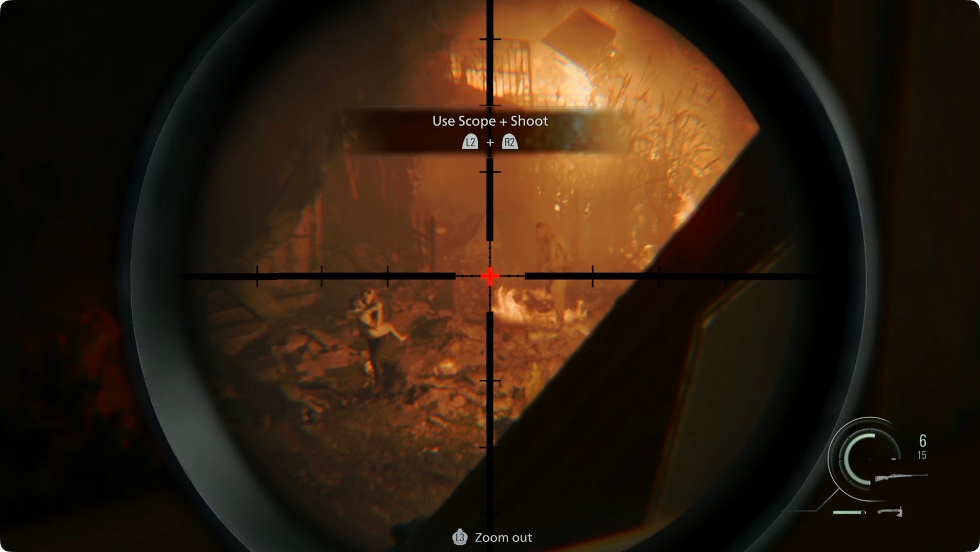 Grab the Rifle Ammo in the window. You’ll have to cover Grace by sniping zombies. She’s down and to the right (look for the flaming helicopter wreckage).