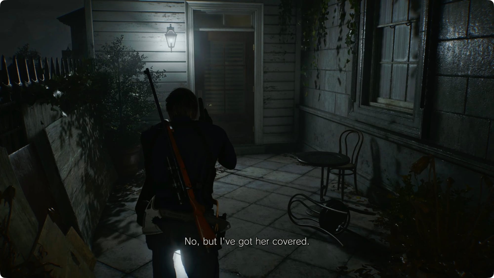 After Leon gazes down the stairway for an awkward amount of time, you’ll pick up as Grace. There’s nothing to pick up and only one path, so just keep going until you hit some conspicuous spotlights at the top of some stairs.