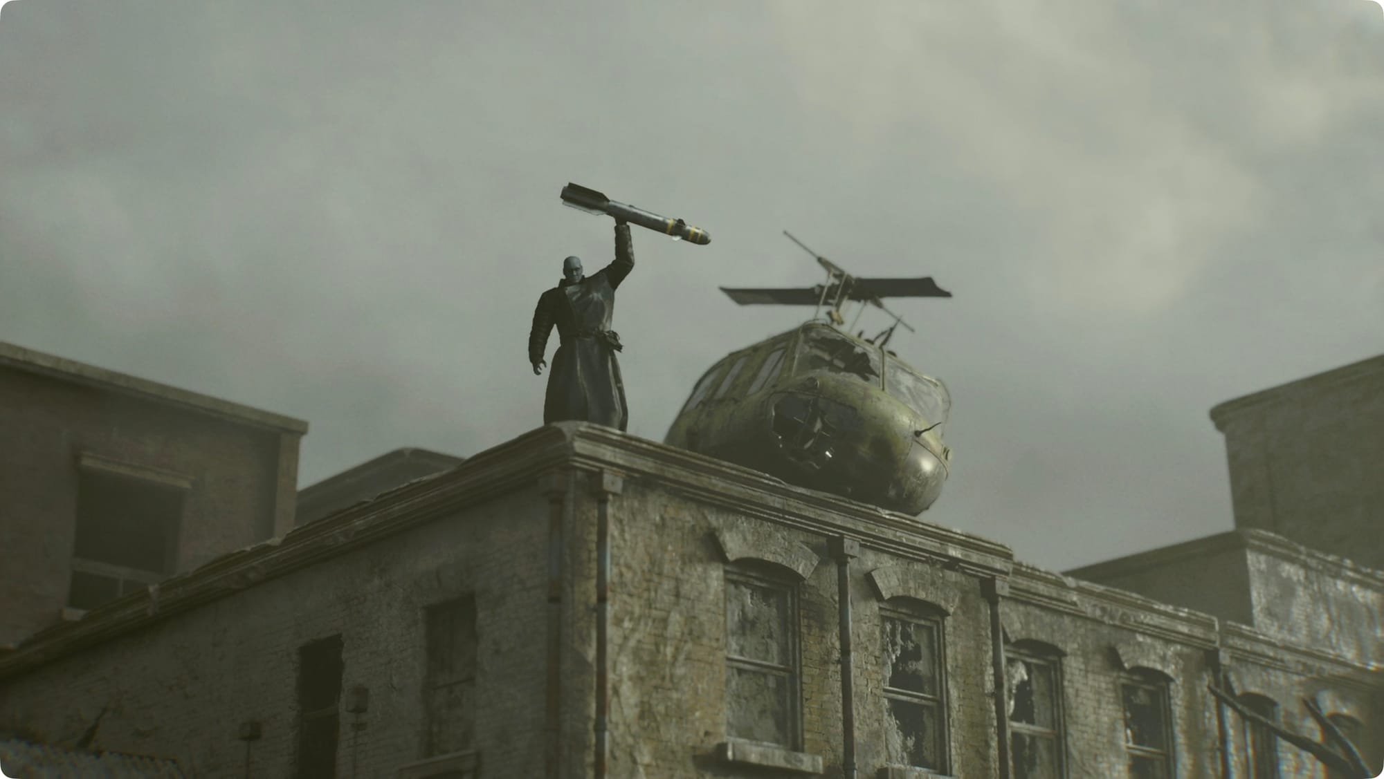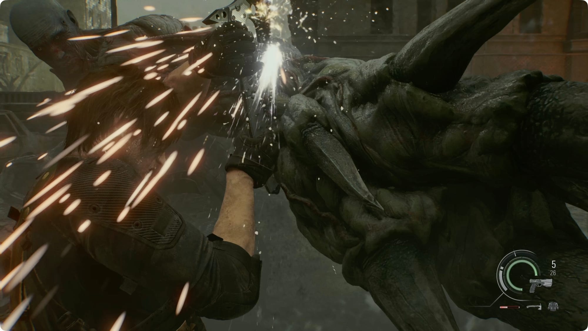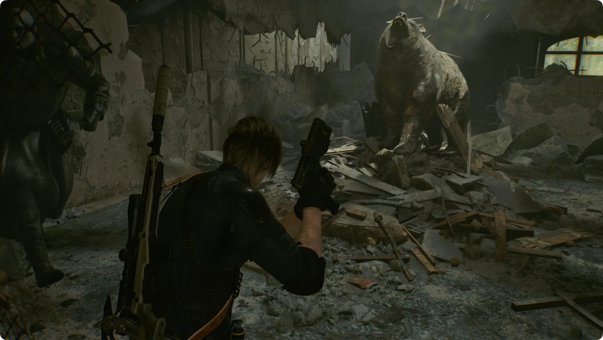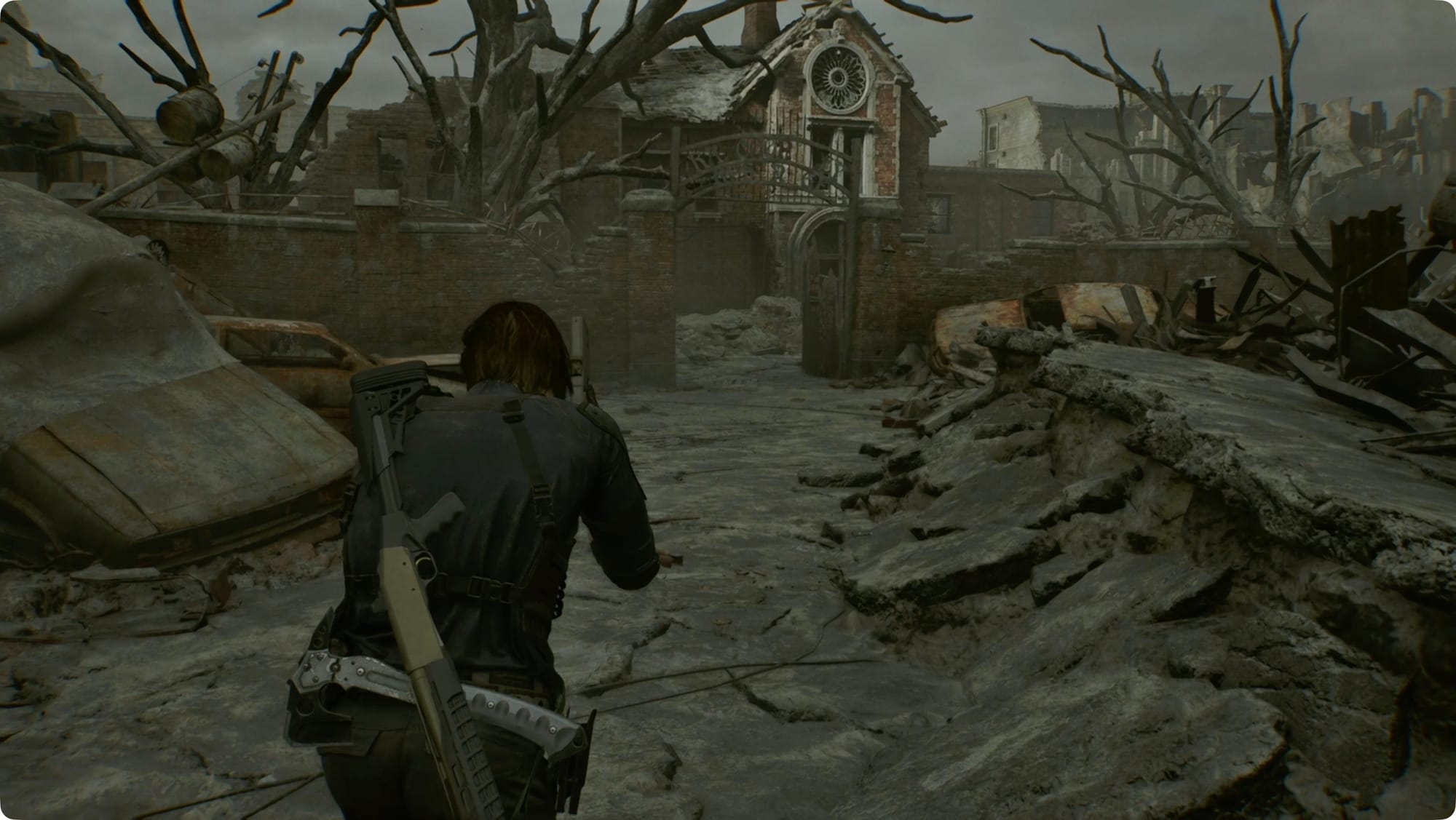 After Leon's adventures in East Raccoon City, you'll have a quick action sequence. (I'm not going to guide the dirt bike chase because the answer at every step is “use your submachine gun to shoot a lot.”). Leon will continue through to Raccoon City Center.