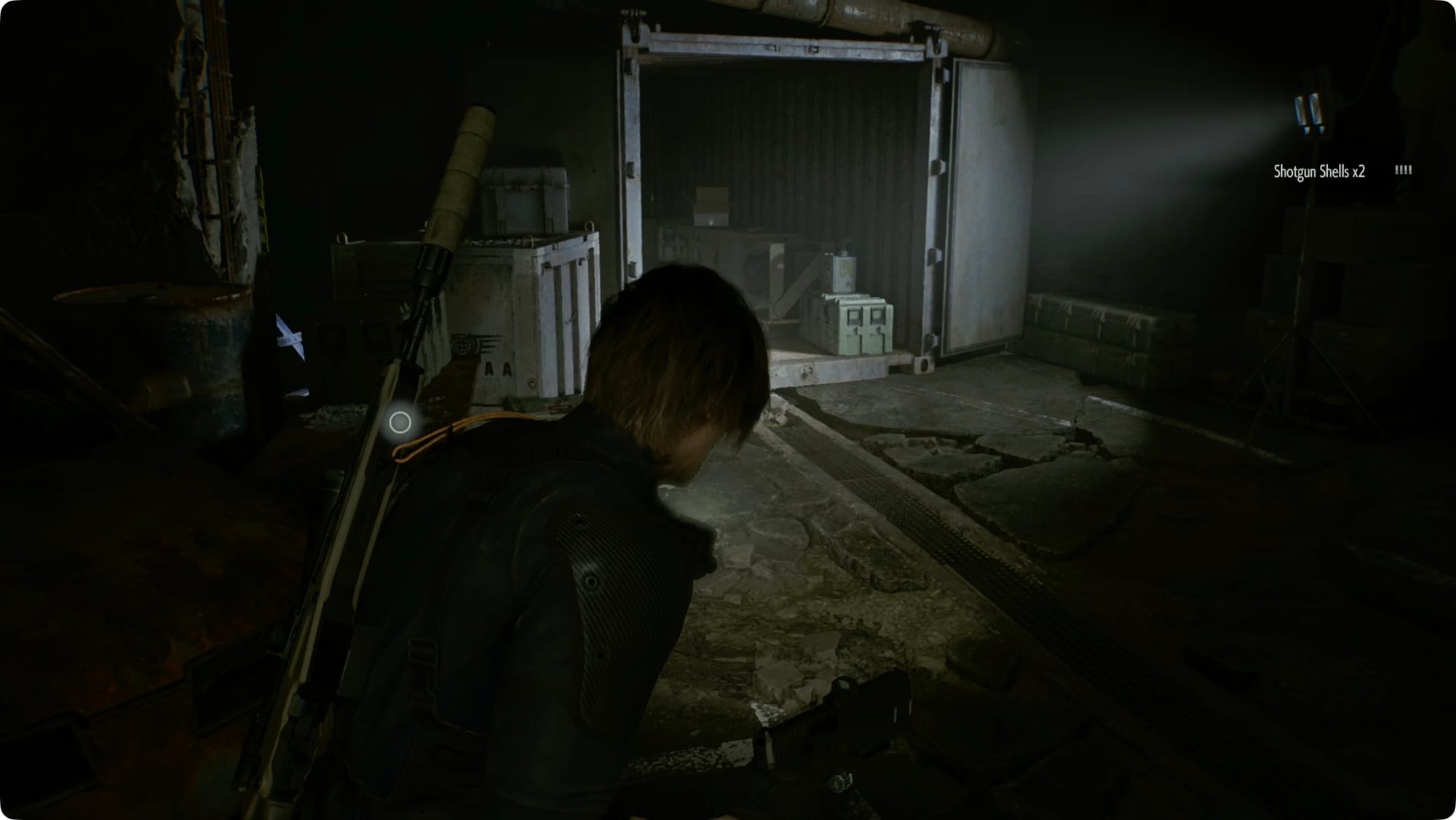 Outside, grab the Rifle Ammo and Shotgun Shells from the table on the left and the Handgun Ammo and Med Injector from the crate on the right as you enter the container.