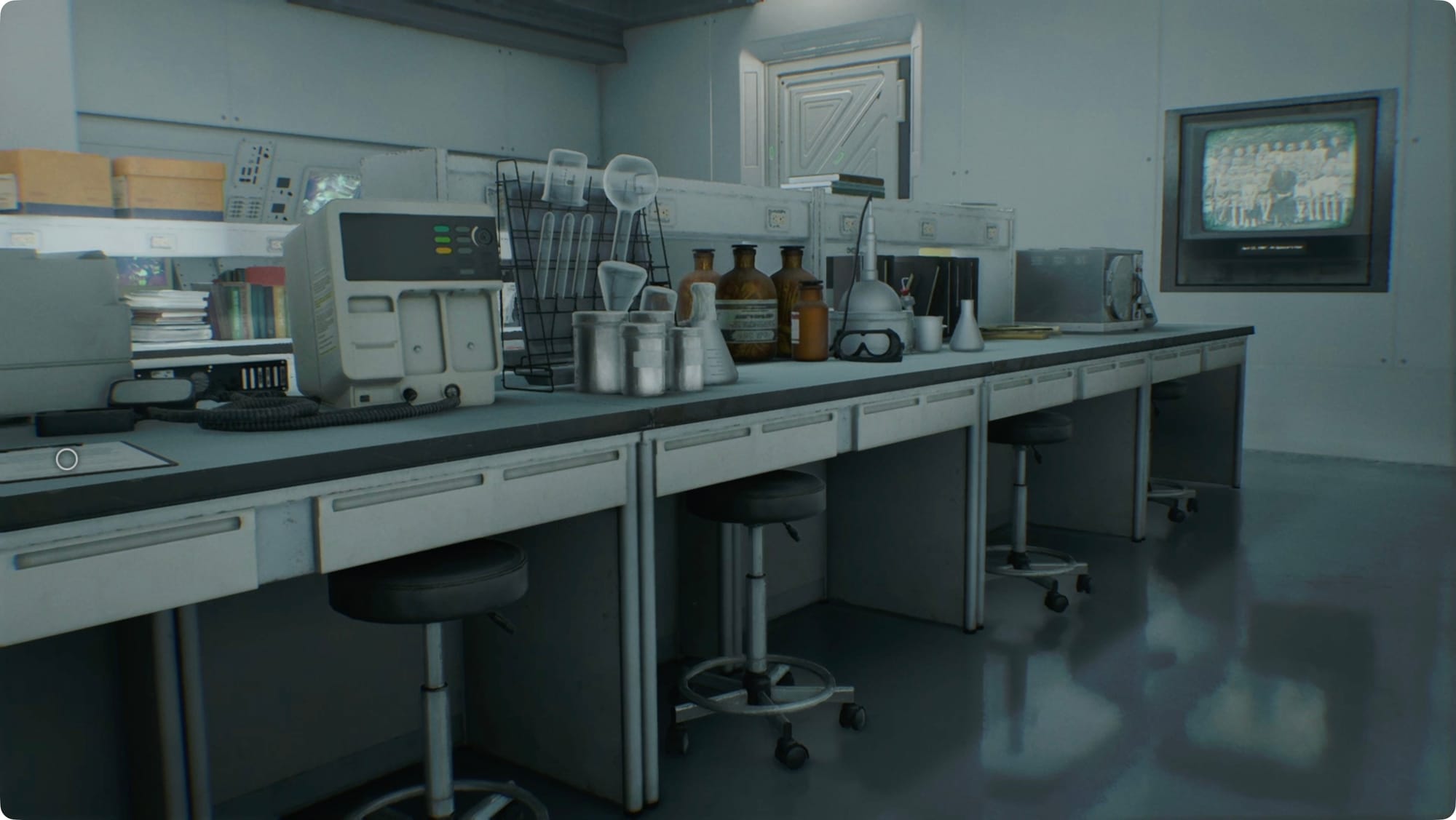 Go out the other door and follow the hall. In the room with the projector, go grab the remote and flip through the slides. You’ll get a cutscene when you hit the last one.