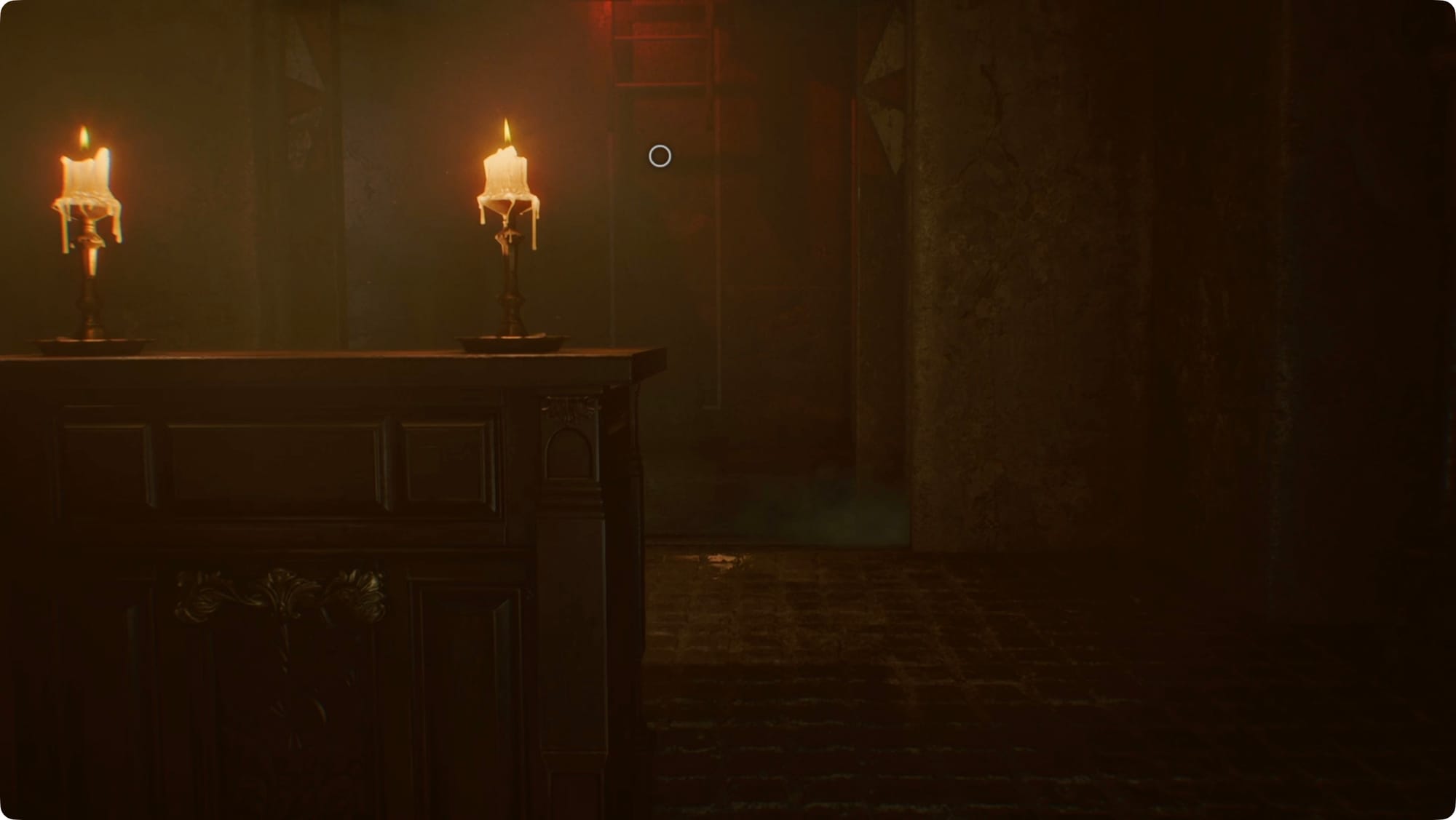 As you approach the altar, doors with the Umbrella Corp. logo will open behind it. Go through and then turn around. Throw the switch on the right side to turn on the lights and open a gate along the left (north) side of the chapel.