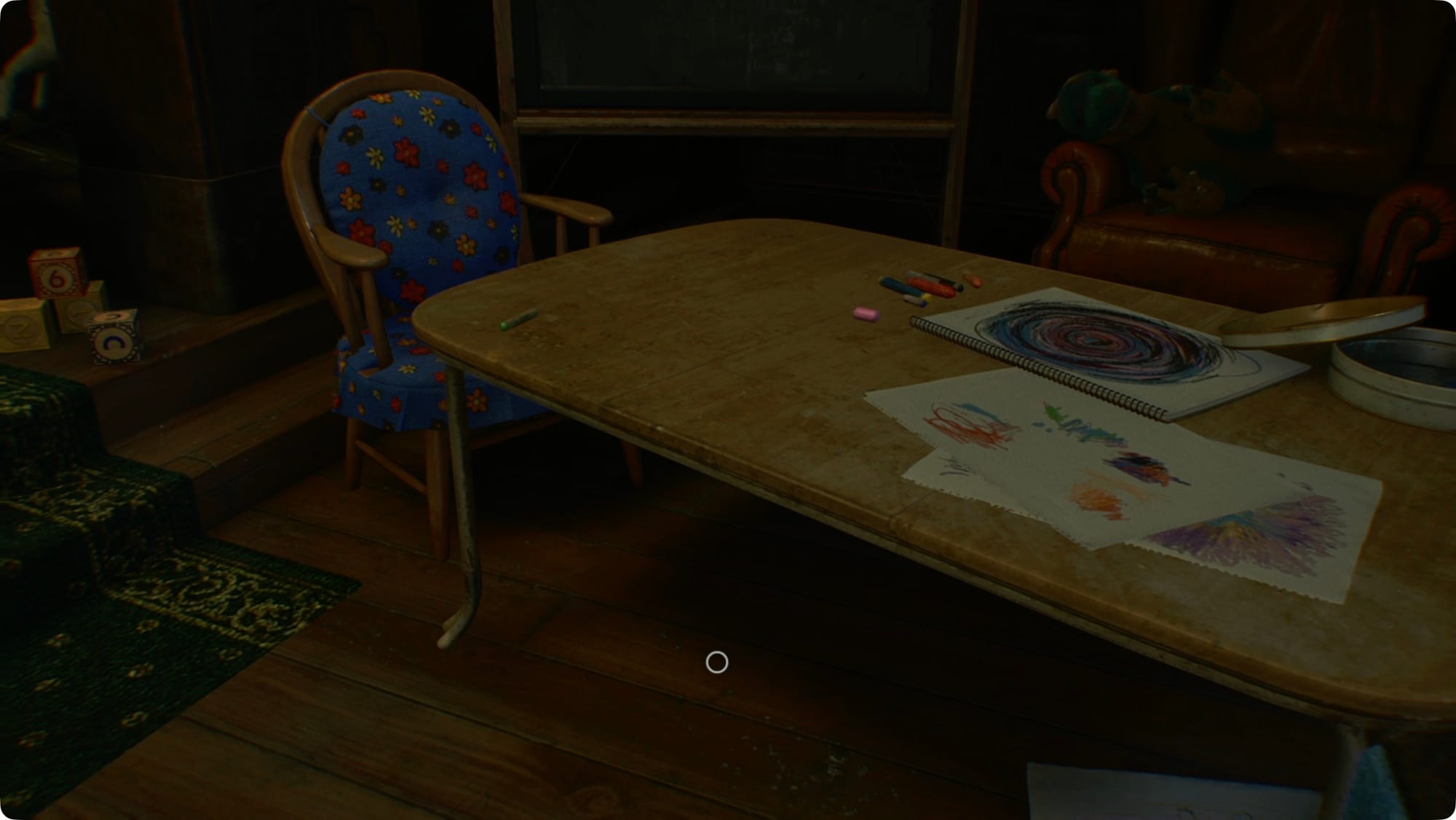 Downstairs, the door out will be locked and the creepy kids will be banging on a window ahead of you. Go hide under the table across from the door.