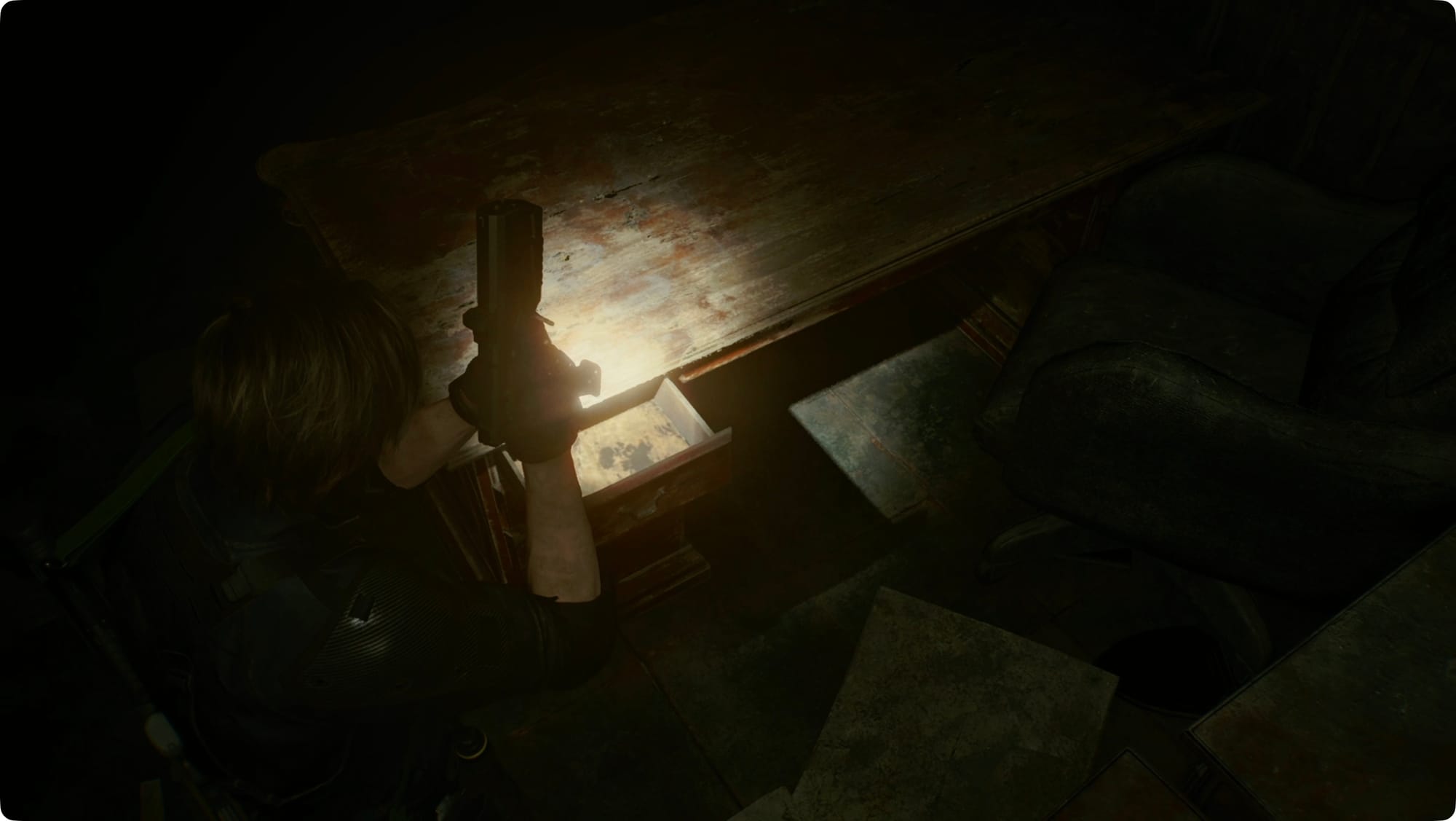 Head back toward the door and take the right into the captain's office. Open the desk drawer, and then click the interact button again (you won't have a prompt). This will reveal the Library Card.