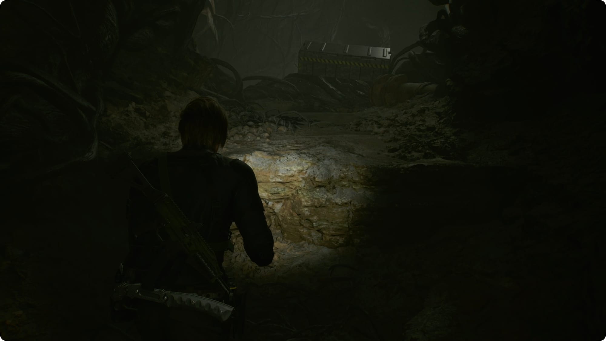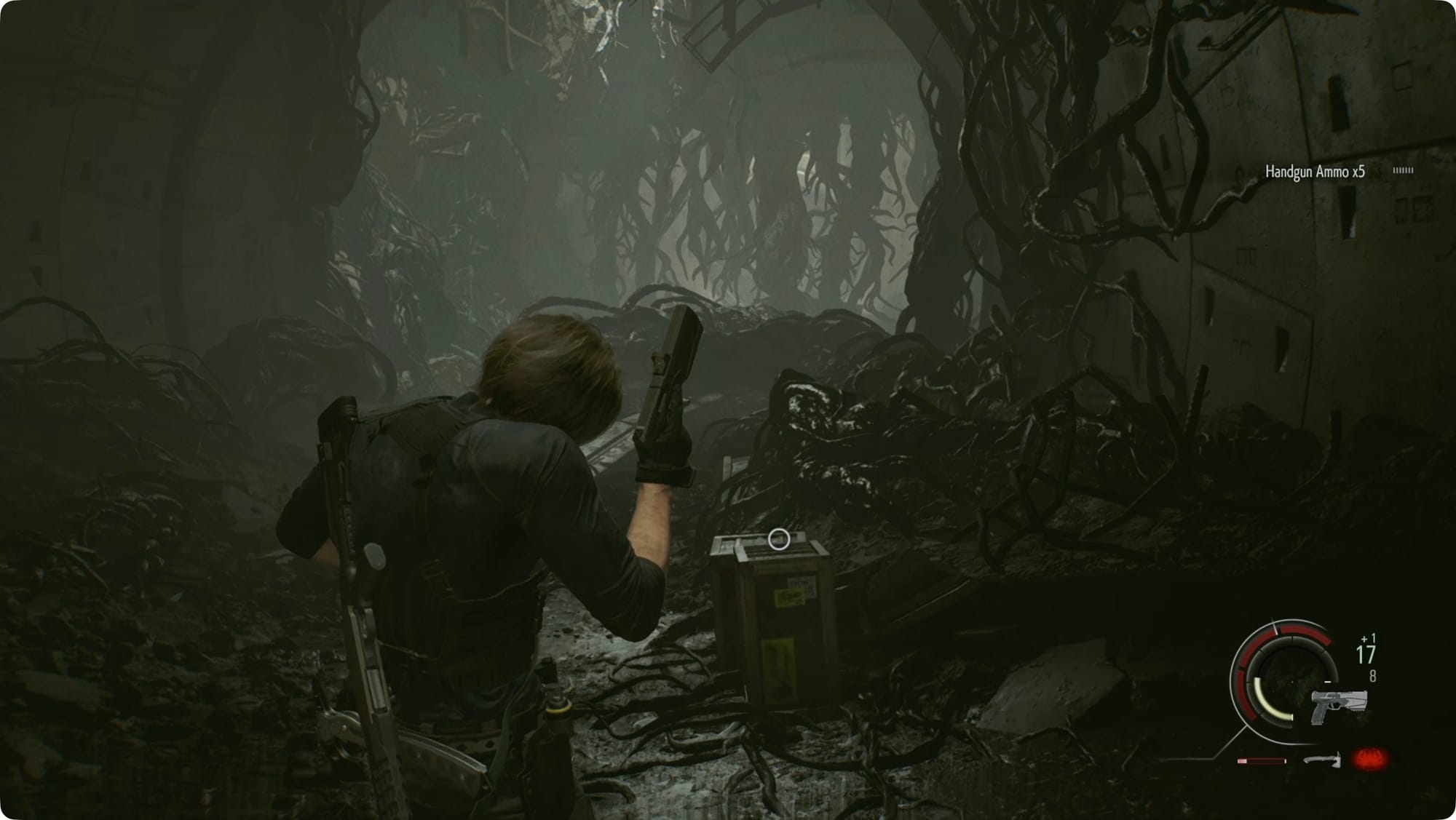 In the new tunnels, follow the only path you can. Right after the first flower-monster, shoot down the case for some Handgun Ammo. Take the next right to find a crate with more Handgun Ammo.