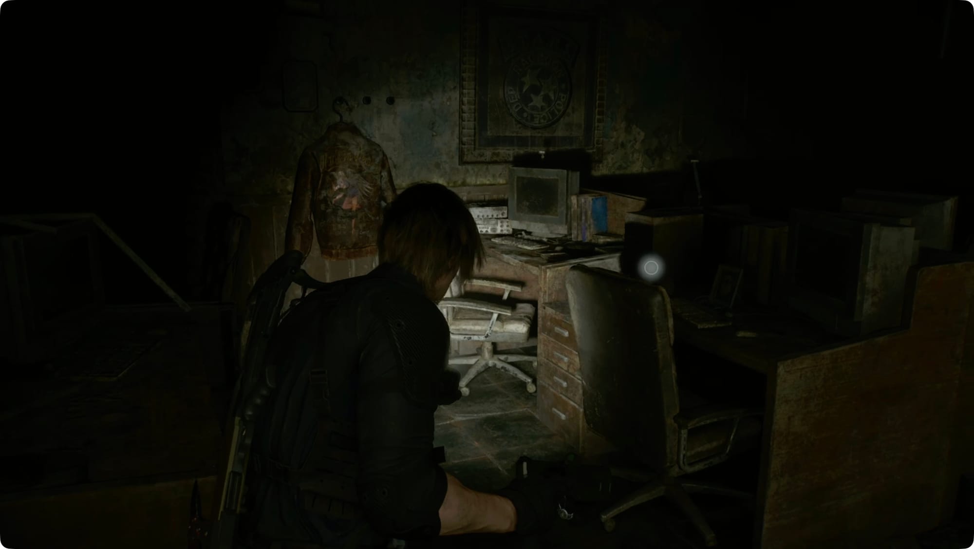 Push through the door leading west, and follow the hall around to the STARS Office. Straight ahead against the east wall, check the leather coat pocket for the Scavenger Hunt - Clue 1.