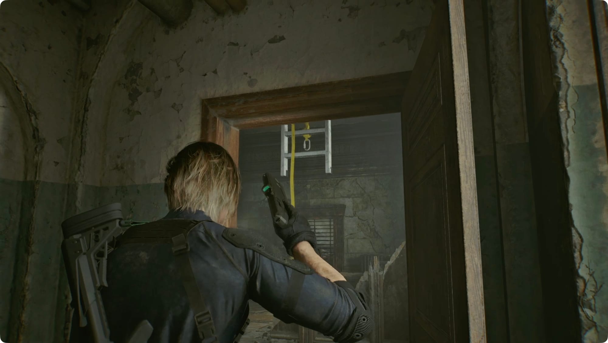 Head back to the hallway and take it south. Take a left at the end, and shoot down the ladder in the next room. Grab the Handgun Ammo and then climb up.