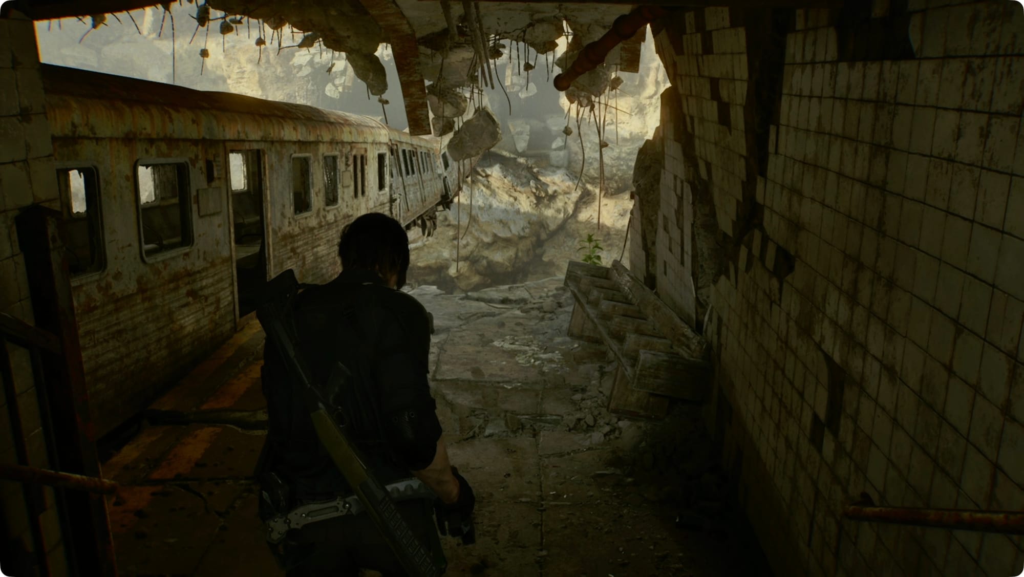 Run through the subway cars until you get jumped by a flower. Shoot it in its flowerface a bunch until you trigger a cutscene that carries you down to the bottom of the crater.